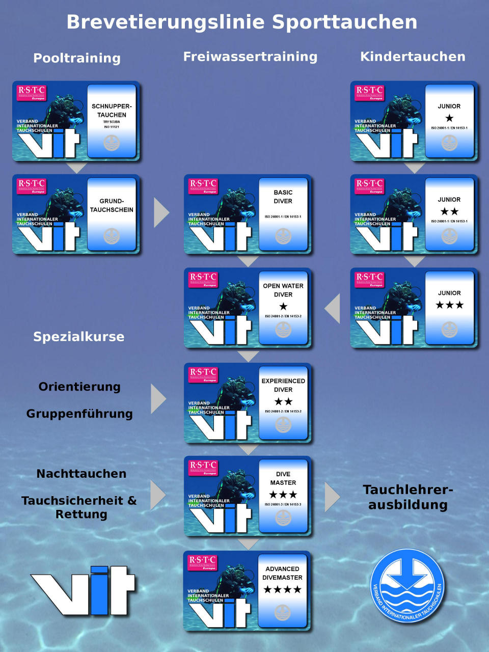 Das Ausbildungssystem des VIT basiert auf jahrzehntelanger Erfahrung und Entwicklung. Dem Tauchschüler werden die praktischen Tauchfertigkeiten fundiert beigebracht und die erforderlichen Kenntnisse über Tauchtheorie und Tauchsicherheit schrittweise vermittelt. Die Qualität der Ausbildung, die Sicherheit und nicht zuletzt der Spaß am Tauchen stehen dabei an oberster Stelle.