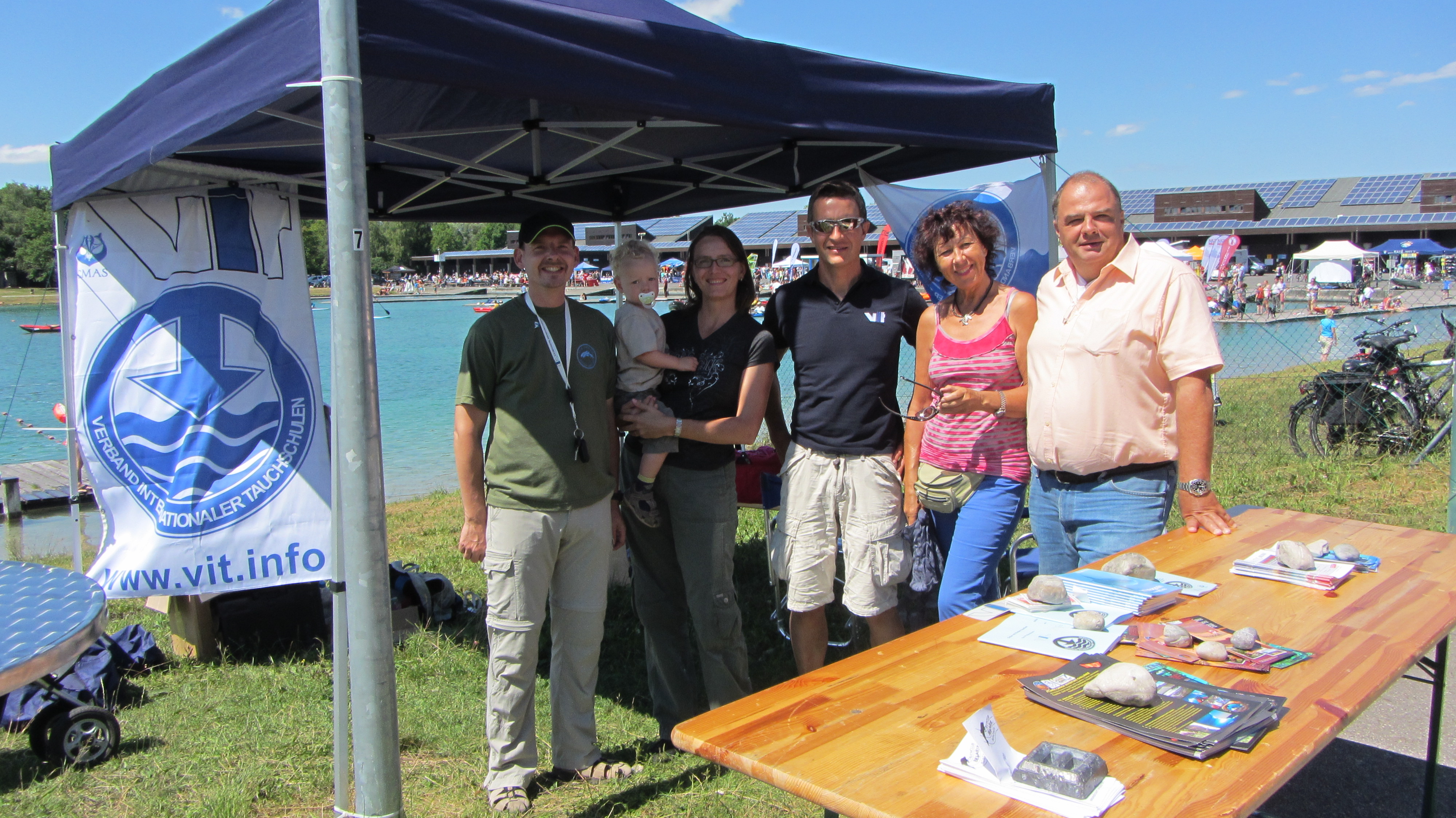 Als am Sonntagvormittag auf einmal heftige Sturmböen über das Gelände an der Ruderregatta bei München fegten, wehte nicht nur das Banner des Verbands Internationaler Tauchschulen im Wind – sondern auch Unterlagen und beinahe der Pavillion. Mit der Hilfe von einigen hilfsbereiten Kindern und beherzten Mitgliedern des VIT-Teams war das Chaos jedoch recht schnell in den Griff zu bekommen.